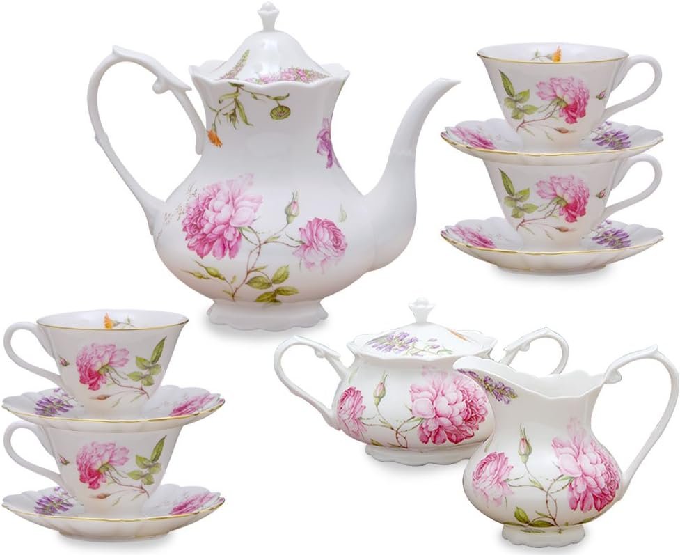 l Tea Set, Tea cups (8oz), Tea Pot (38oz), Creamer and Sugar Set, Tea Sets for Women, Tea Cups and Saucer Set, China Tea Set for Adults, 4 Tea Cups Set