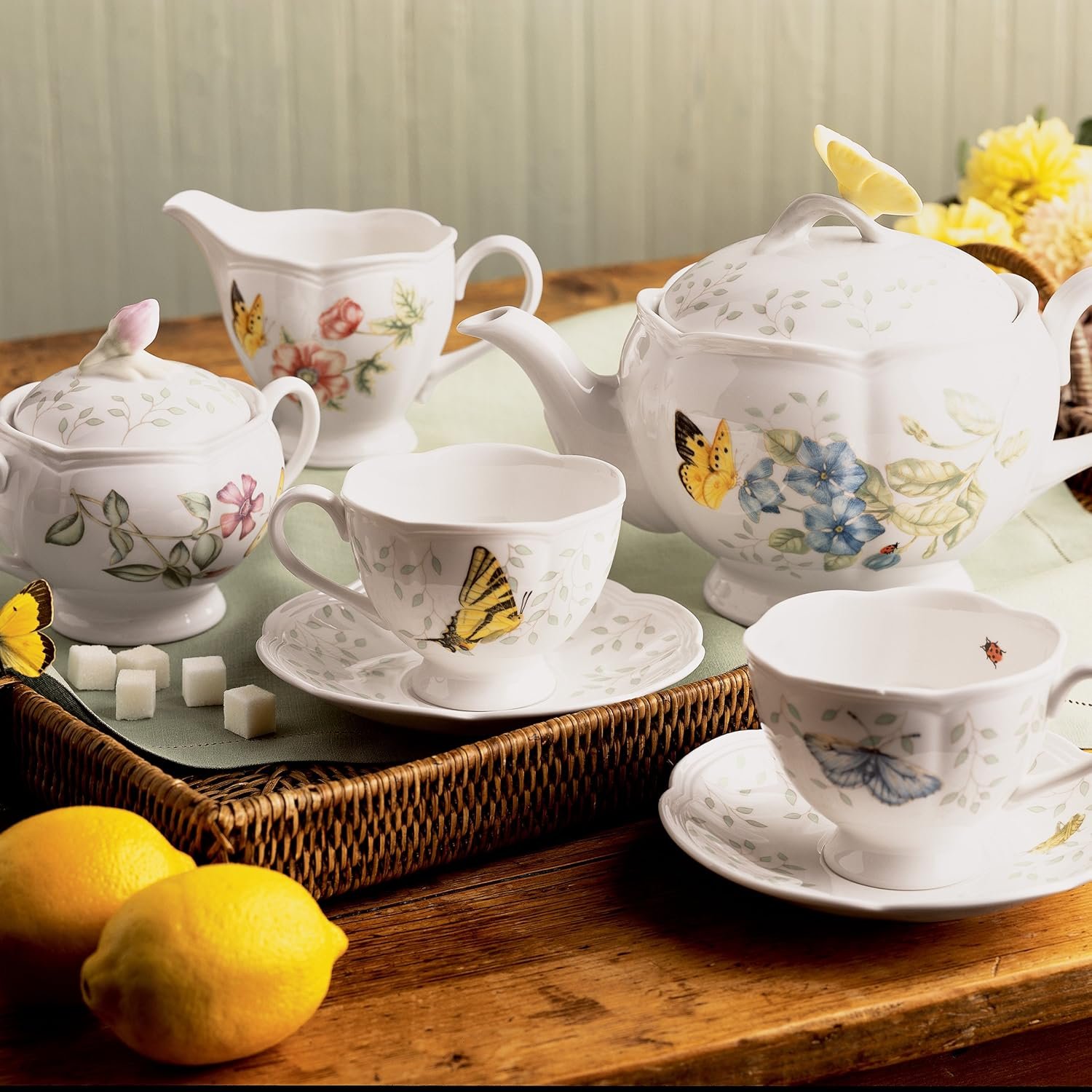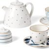 • 48 ounce teapot; 7 ounce creamer; 4 1/2 inch sugar bowl; 2 each: 2 7/8 inch teacup; 6 1/8 inch saucer
