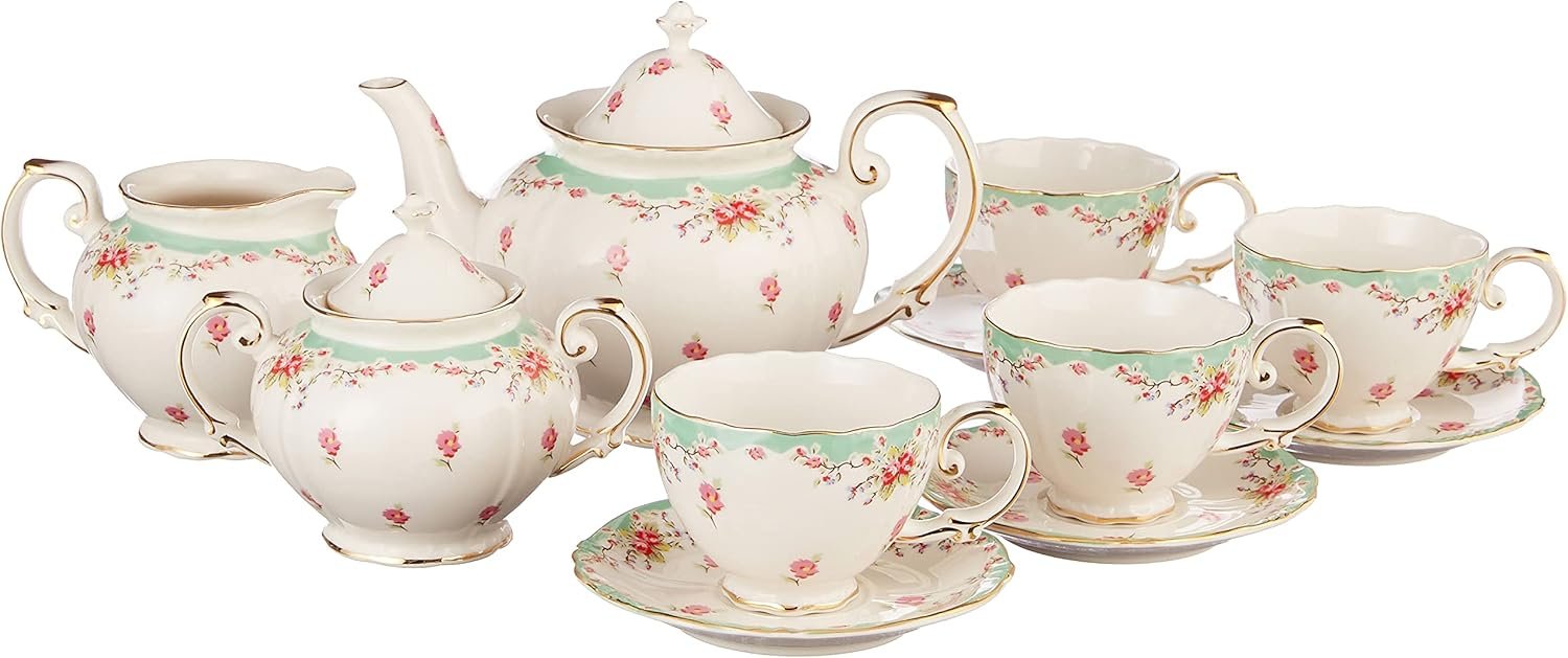 l Tea Set, Tea cups (8oz), Tea Pot (38oz), Creamer and Sugar Set, Tea Sets for Women, Tea Cups and Saucer Set, China Tea Set for Adults, 4 Tea Cups Set
